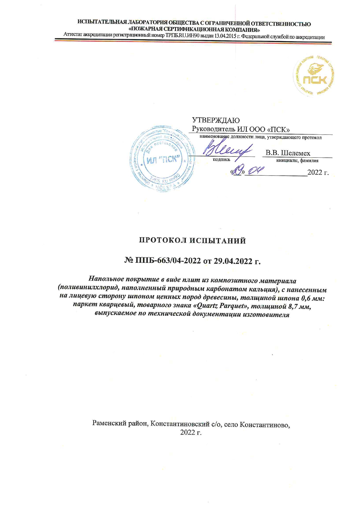 Протокол испытаний Quartz Parquet