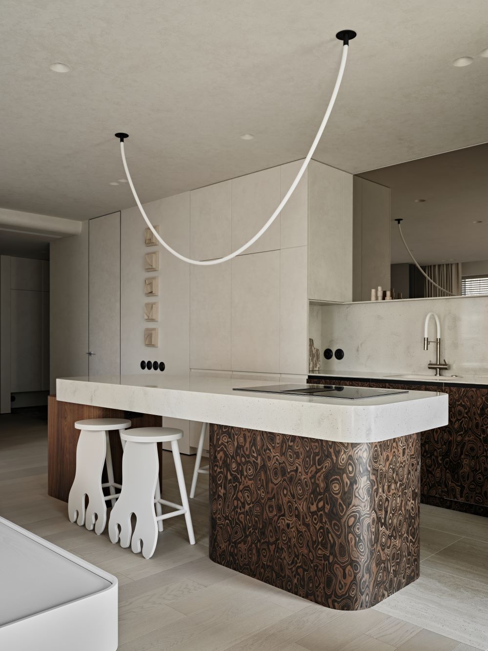 Основная задача — сохранить планировку, но полностью изменить ощущение пространства с помощью мягкой геометрии, продуманного света и правильных материалов.